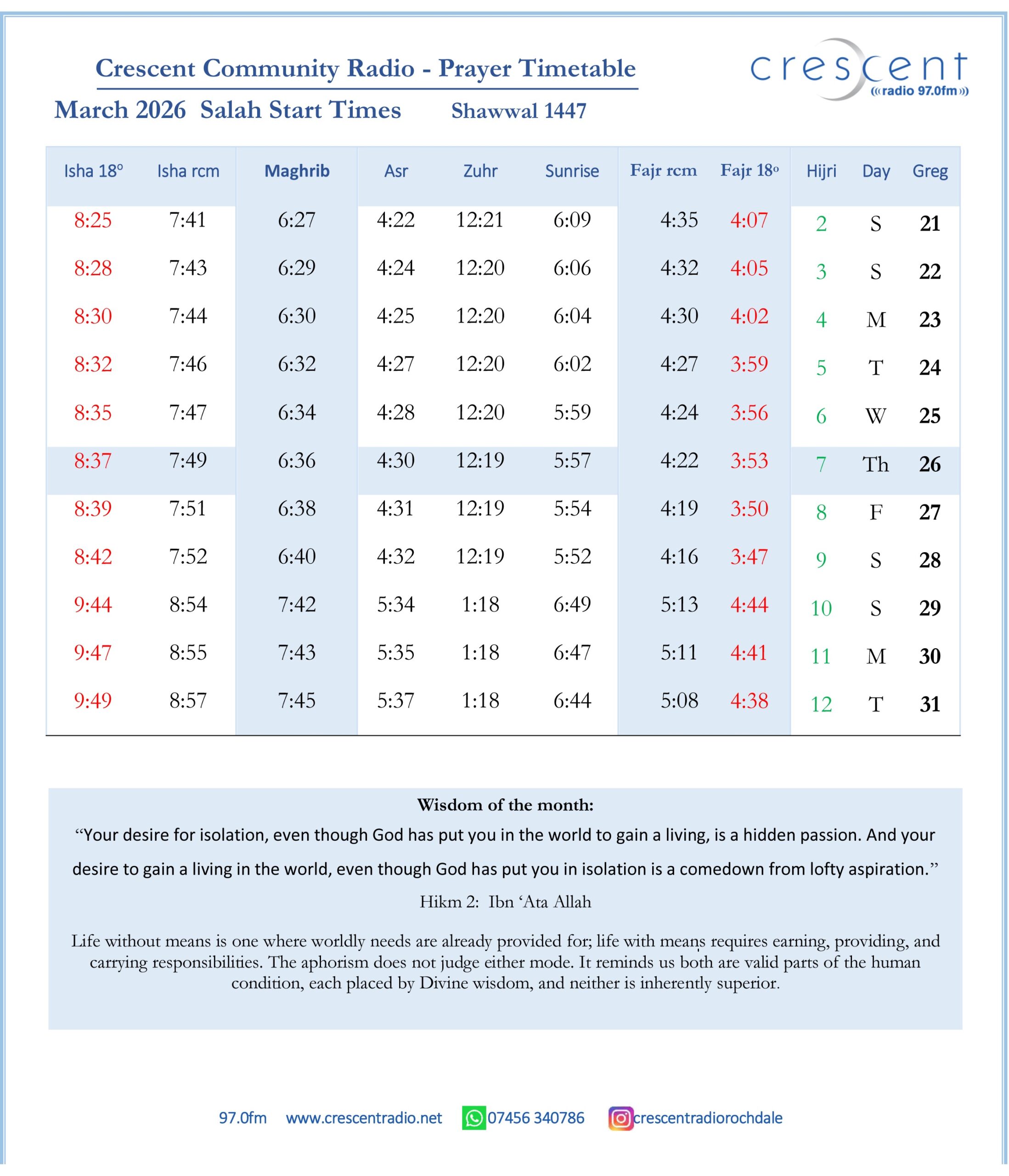 | Prayer times (RCM) 20th March 2026 1 Shawwal 1447 |